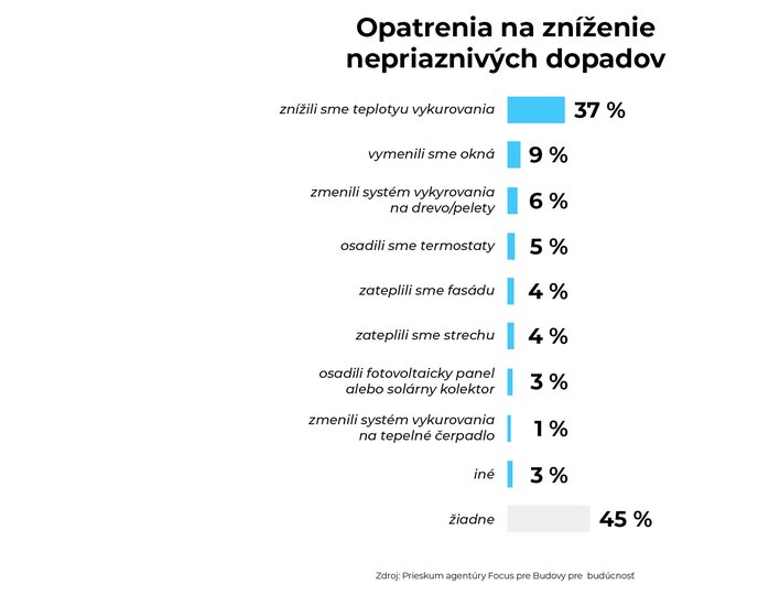 Viac ako tretina majiteľov domov si v minulom roku vylepšila svoje vykurovanie, alebo konštrukciu domu. Najviac z nich vymenilo okná (9%), zmenilo systém vykurovania na drevo či pelety (6%) a osadilo termostaty (5%). Iba 8% z opýtaných zateplilo fasádu alebo strechu, pritom celkové zateplenie domu je najúčinnejším opatrením pre dlhodobú úsporu energie a tepelný komfort domácnosti. Zvyšné opatrenia majiteľov domov sa týkali inštalácie fotovoltaického panelu, solárneho kolektoru či tepelného čerpadla (4%).