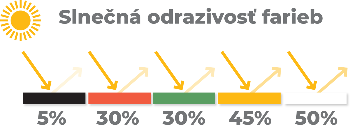 Tmavé farby môžu zdvihnúť teplotu povrchu steny alebo strechy aj o niekoľko stupňov. Je to preto, že viac priťahujú slnečné lúče a infračervené žiarenie. Preto zvoľte radšej svetlejšie tóny omietky. Ak predsa len túžite po efektných tmavých odtieňoch, nepoužite ich na celú fasádu a vytvorte len farebné akcenty. Tmavé obklady z kameňa alebo keramiky zas môžete umiestniť na prevetrávanú fasádu, ktorá má medzi obvodovou stenou a izoláciou vzduchovú medzeru, neprepúšťa teda toľko tepla ako kontaktná, ukotvená priamo na stenu. Pre strešnú krytinu tiež radšej vyberajte čo najsvetlejšiu farbu, alebo krytinu s reflexným povrchom, ktorý odráža tepelné žiarenie.